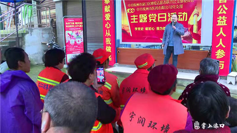 2021年4月11日,株洲市醫藥有限公司黨支部與淥口區博愛義工聯合會黨支部聯合開展了“學黨史、礪初心、我為群眾辦實事”的主題黨日活動?;顒釉诩ぐ旱拇蠛铣侗本┑慕鹕缴稀分欣_帷幕,志愿者和環衛工人用最真誠的歌聲,唱出對黨對祖國的熱愛。株洲市醫藥公司黨支部書記周暉為在場人員分享了黨史故事,他從紅船精神談到毛澤東的詩詞“沁園春?雪”,再到中國共產黨的兩個100年,讓大家深刻認識到紅色政權來之不易、新中國來之不易,活動最后,志愿者們就黨史小知識與在場人員進行互動答題。